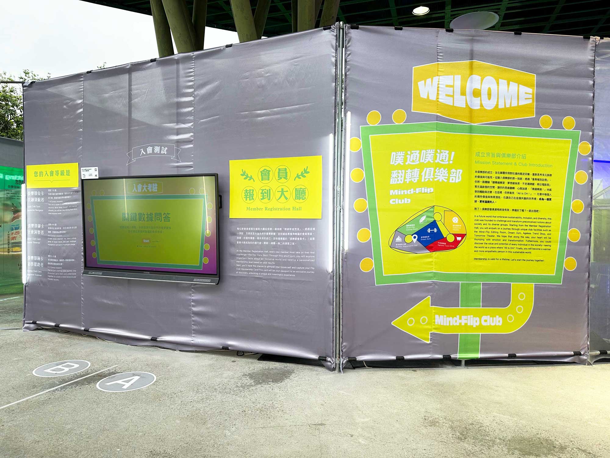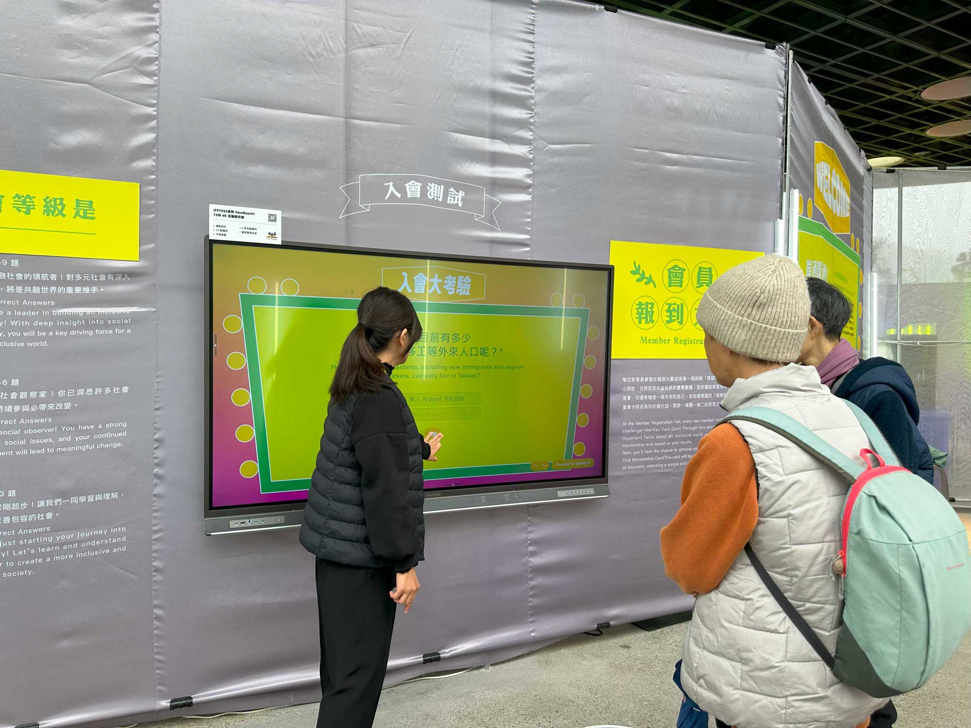 在展覽「入口大廳」,ViewSonic 提供ViewBoard 75吋4K互動顯示器,展示「入會大考驗」互動遊戲,觀眾可透過觸控螢幕參與趣味問答,在寓教於樂的體驗中了解社會知識。不僅取代傳統紙本看板,減少紙張印刷與耗材,同時也讓參觀者主動參與、增加停留時間,強化展場互動性與教育意義。