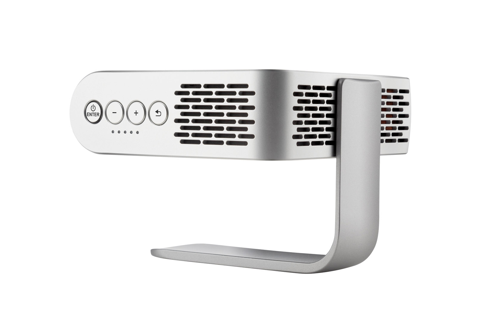 “From the time we first unboxed the ViewSonic M1, we were impressed with how this device looks and feels. The projector is compact and fits easily in one hand, so it's small and light enough to carry around in a backpack. Perhaps the most interesting design aspect here is the swivel stand, which serves as a lens cap when the projector isn't in use. The stand swivels 360 degrees, and can be used to conveniently set the angle of the projection as well.”