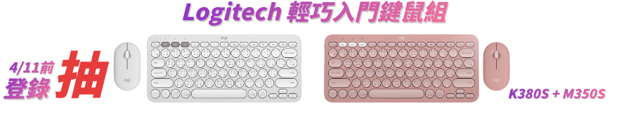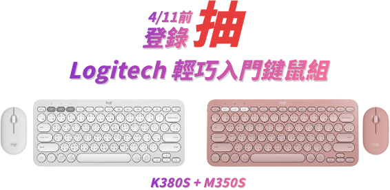 「Logitech輕巧入門鍵鼠組」(K380s+M350s)乙份(價值1,849元),玫瑰粉/珍珠白各2組,共4組。