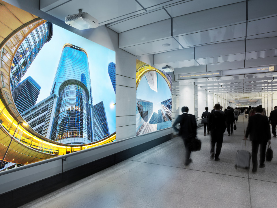 This easy-to-install projector allows for an image size of up to 170”, offering a lower cost-per-inch compared to other types of commercial displays.Up to 170”
