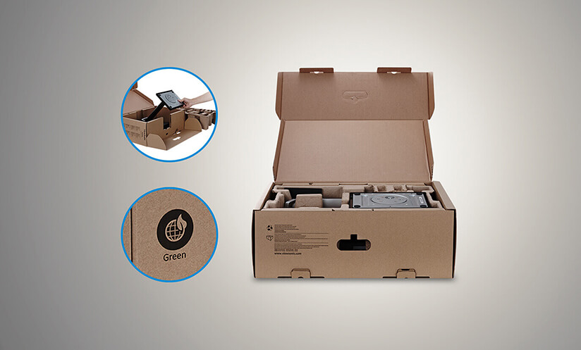 Ці монітори постачаються в екологічно чистій, біологічно розкладаній паперовій упаковці, яка скорочує витрати на переробку та зменшує вплив на навколишнє середовище. Зручне відкриття коробки спрощує розпакування для швидкого встановлення монітора без зайвих перешкод.