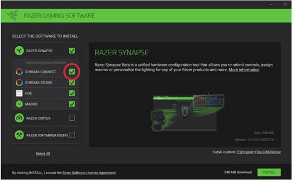 * УВАГА! Переконайтеся, що поле “CHROMA CONNECT” також обрано перед завантаженням Razer Synapse. Це необхідно для підключення монітора.