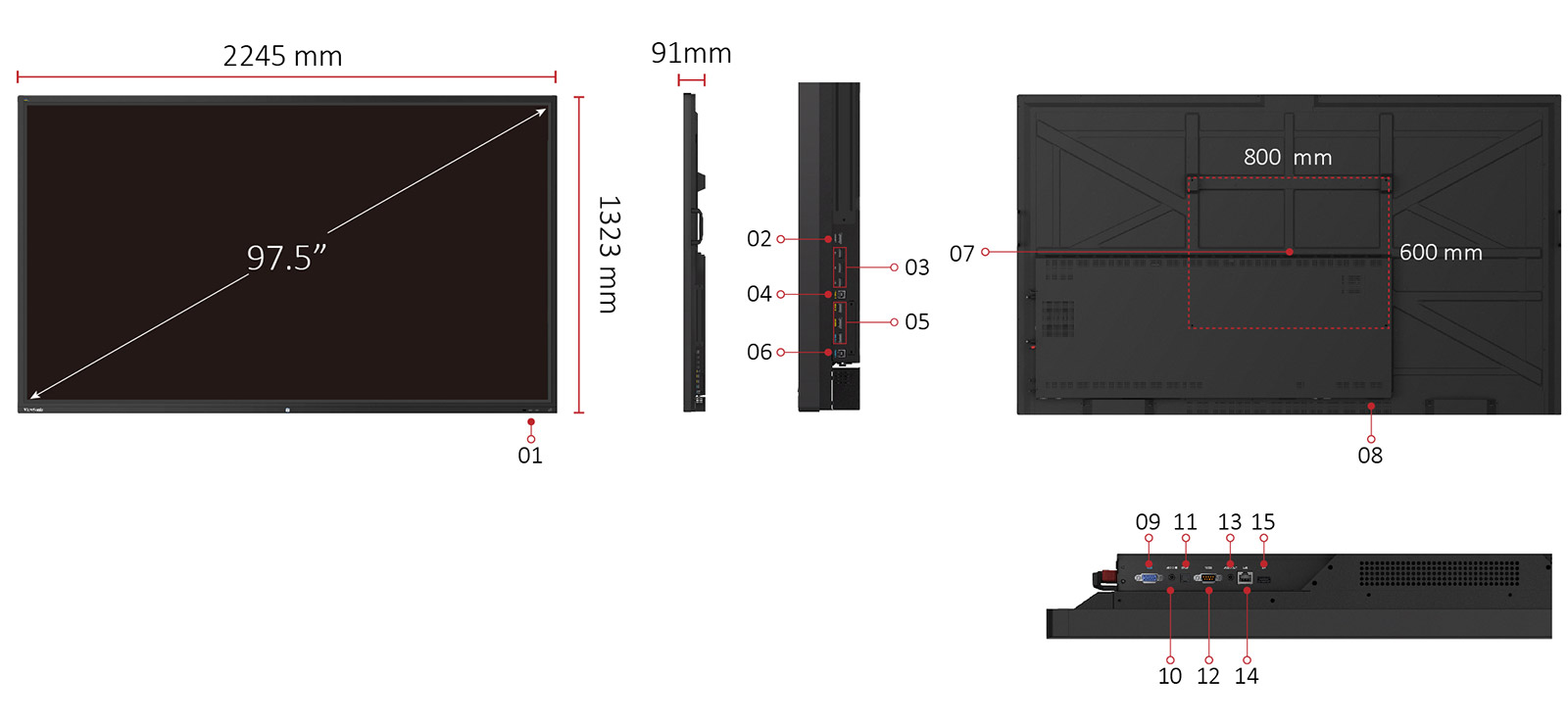 | PACKAGE CONTENTS: | 1. Power cable(3 meters) x 4 2. Remote control 3. USB cable(5 meters) 4. Touching pen x 2 5. Quick Start Guide 6. RS232 adapter 7. Clamp x 5 8. Plate 9. Screw x 8 10. HDMI cable |