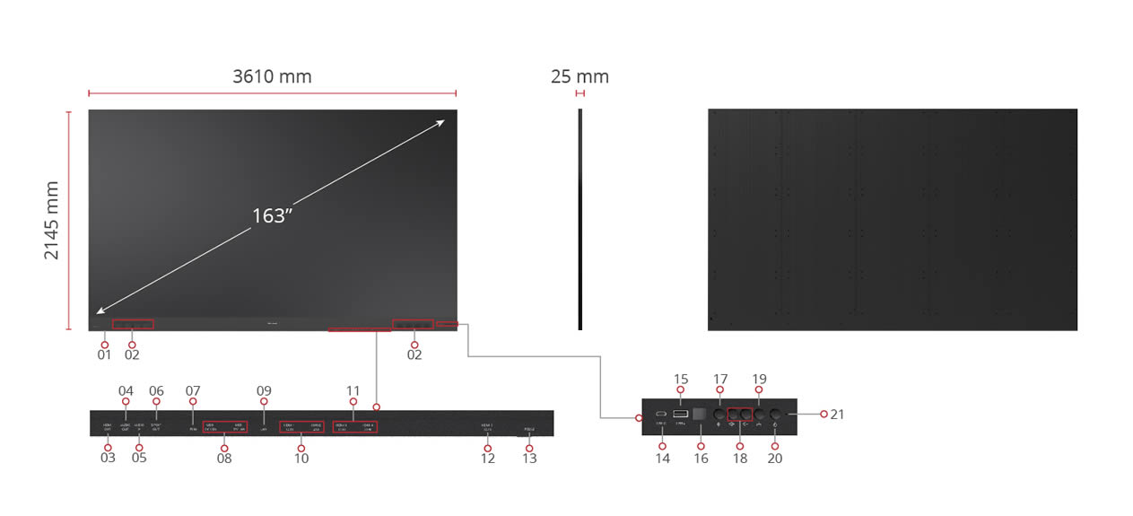 Gaze upon astoundingly lifelike imagery on the minimalistic 2nd Gen 163” ViewSonic® LDP163-181 All-in-One Direct View LED display. The All-in-One modular design offers an effortless installation and maintenance process. This next-generation display is upgraded with advanced features to deliver a spectacular audiovisual experience and user-forward design. Delivering 120% Rec. 709 wide colour gamut, lightning-fast 4,440Hz refresh rate, and a peak brightness of 600 nits, every video, presentation, or lecture will be an immersion of real-to-life colour and extraordinary detail. The display is also equipped with Harman Kardon speakers, 4K/HDR/HLG support, and Frame Interpolation technology for unsurpassable, immersive content delivery. At 25mm slim and lined with a 5mm frameless edge, the sleek display exudes sophistication and elegance in any modern setting. It offers flexibility and adaptability in design – with portrait and landscape installations to complement any space and scenario. The screens can be easily fused together to form an ultra-wide 32:9 video wall to deliver a seamless visual experience in epic proportions. The system control box can also be easily detached to blend into every design.