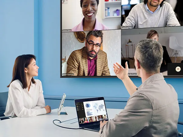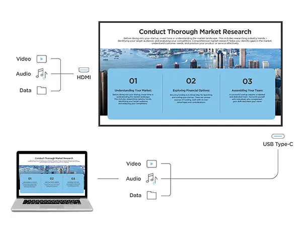 Plug in and go. One USB-C cable plus HDMI handles video, data, and power, making it easy to share content and connect laptops in any meeting space.