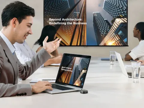 In modern workplaces and schools, people bring their own devices. The WPD-900 is designed to handle them all. It connects via USB-C to laptops, tablets, and smartphones, including the iPhone 15. Plus, the transmitter features a pass-through port, so you can charge your device right through the dongle while you present.