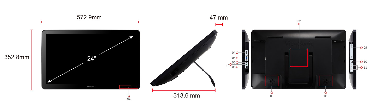 Kích thước không có chân đế (mm): 573 x 353 x 47 - Tổng quanQuy định: cTUVus, FCC-B, ICES003, Energy Star, CEC, Adaptor AR Certified, MX-CoC, Mexico Energy, CE, CE EMC, CB, RoHS, ErP, REACH, WEEE, EAC, UkrSEPRO, CCC, China RoHS, China Energy Label, CECP