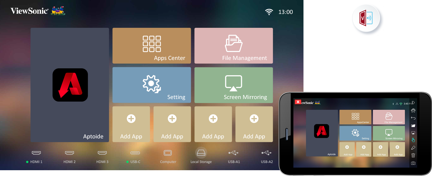 Giờ đây, bạn có thể biến thiết bị di động của mình thành một bộ điều khiển từ xa mạnh mẽ – dễ dàng điều khiển cảm ứng, dễ dàng nhập văn bản và tạo chú thích đơn giản trên màn hình lớn. Chỉ cần tải xuống ứng dụng ViewSonic vCastSender trên điện thoại, đảm bảo điện thoại và máy chiếu của bạn được kết nối với cùng một mạng Wi-Fi và ghép cặp trong ứng dụng để bắt đầu trình chiếu.