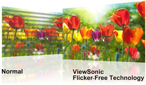 ViewSonic flicker-free displays deliver on the promise of more comfortable viewing. ViewSonic flicker-free technology nearly eliminates screen flickering at all brightness levels by providing a constant LED light source. This lets you work at your computer, play games, or watch movies longer – without eye fatigue. Care for your eyes with ViewSonic flicker-free technology!