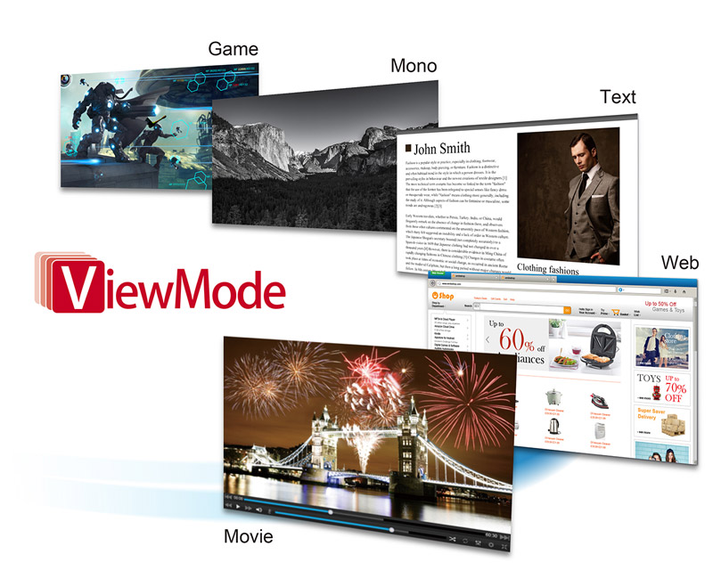 ViewSonic’s unique ViewMode feature offers “Game,” “Movie,” “Web,” “Text,” and “Mono” presets. These presets enhance gamma curve, color temperature, contrast, and brightness to deliver an optimized viewing experience for different screen applications.