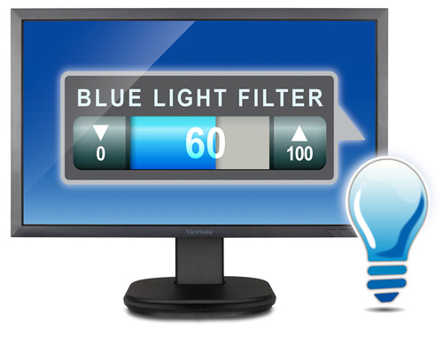 ViewSonic monitors feature a Blue Light Filter setting that allows users to adjust the amount of blue light emitted from the screen, enabling longer viewing times and increased eye comfort for work and multimedia applications.