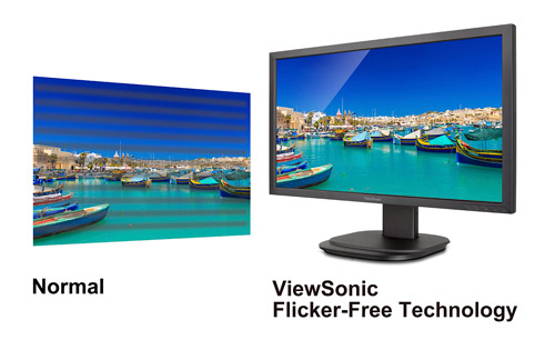 ViewSonic flicker-free monitors deliver a more comfortable viewing experience. Rather than using Pulse Width Modulation that continuously turns the LED backlight on and off, ViewSonic flicker-free monitors use DC modulation backlights that maintain a steady stream of direct current power—nearly eliminating screen flickering at all brightness levels by providing a constant LED light source.