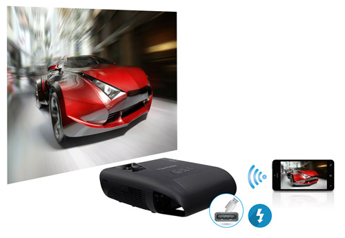 The 5V/2A USB and Micro USB ports deliver more charging power 10W than a normal USB port, allowing users to charge mobile devices in less time. In addition, wireless HDMI dongles can be plugged into the projector’s HDMI port while being powered by a USB cable plugged into the USB port for Full HD contents.