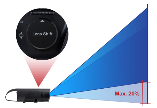 Unlike creating image quality deterioration from making Keystone adjustments, the lens shift function is the best image-positioning tool, preventing image quality loss. This tool-free control knob controls the lens shift function easily, so users can enjoy projection setup everywhere, with less locational limitations. If further adjustment is needed, users can also utilize the vertical lens shift function and finally the Keystone function if absolutely necessary.