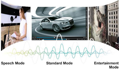 The exclusive SonicMode sound settings deliver optimized audio performance for presentations, video clips and music. The "Standard" preset offers the best sound levels for general use. The "Speech" preset enhances the sound of spoken words, making it ideal for projecting speeches and lectures, or for sales calls and video conferencing. The "Entertainment" preset is fine-tuned with more bass and richer mid-high frequencies ideal for music and movies.