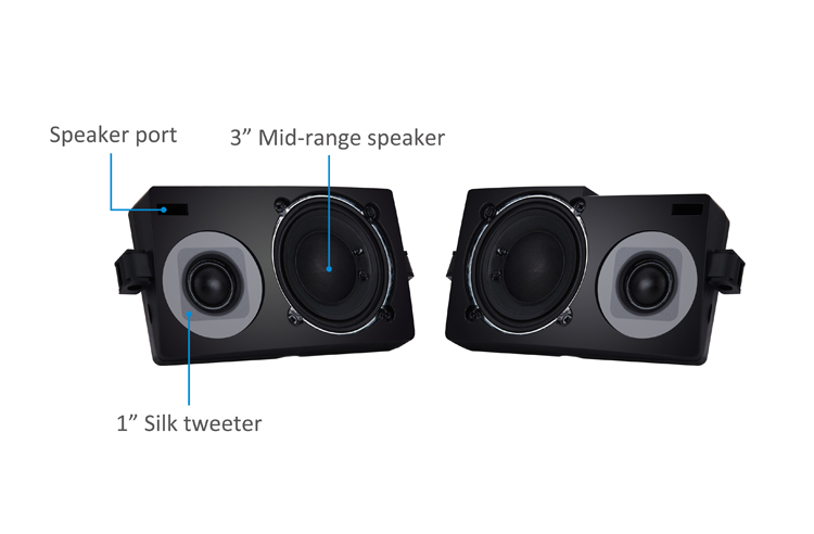 LS810’s speaker system comes equipped with a 3” mid-range speaker paired with a 1” silk tweeter for achieving a more balanced, lifelike sound quality. The speaker’s ported design allows sound to be thrown further for louder, more concentrated sound.