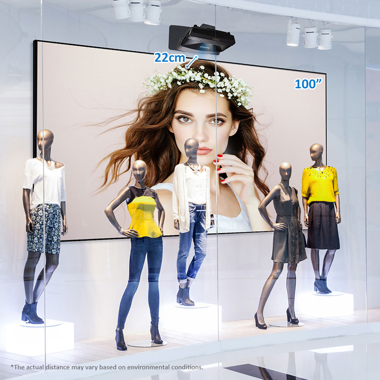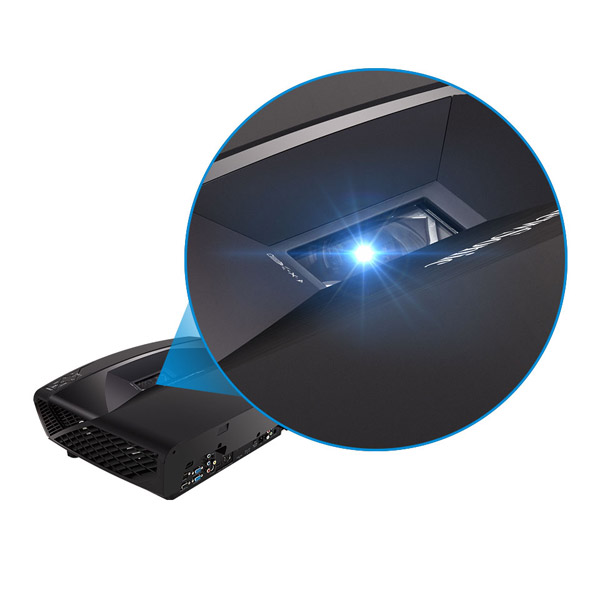 0.24 ultra-short throw lens allows for simple and flexible set up. Placing it as close 22cm* away from a wall will project a 100” image and give the projector a subtle presence. *The actual distance may vary based on environmental conditions.