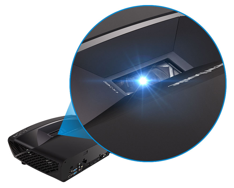 0.23 ultra-short throw lens allows for simple and flexible set up. Placing it as close 21cm away from a wall will project a 100” image and give the projector a subtle presence.