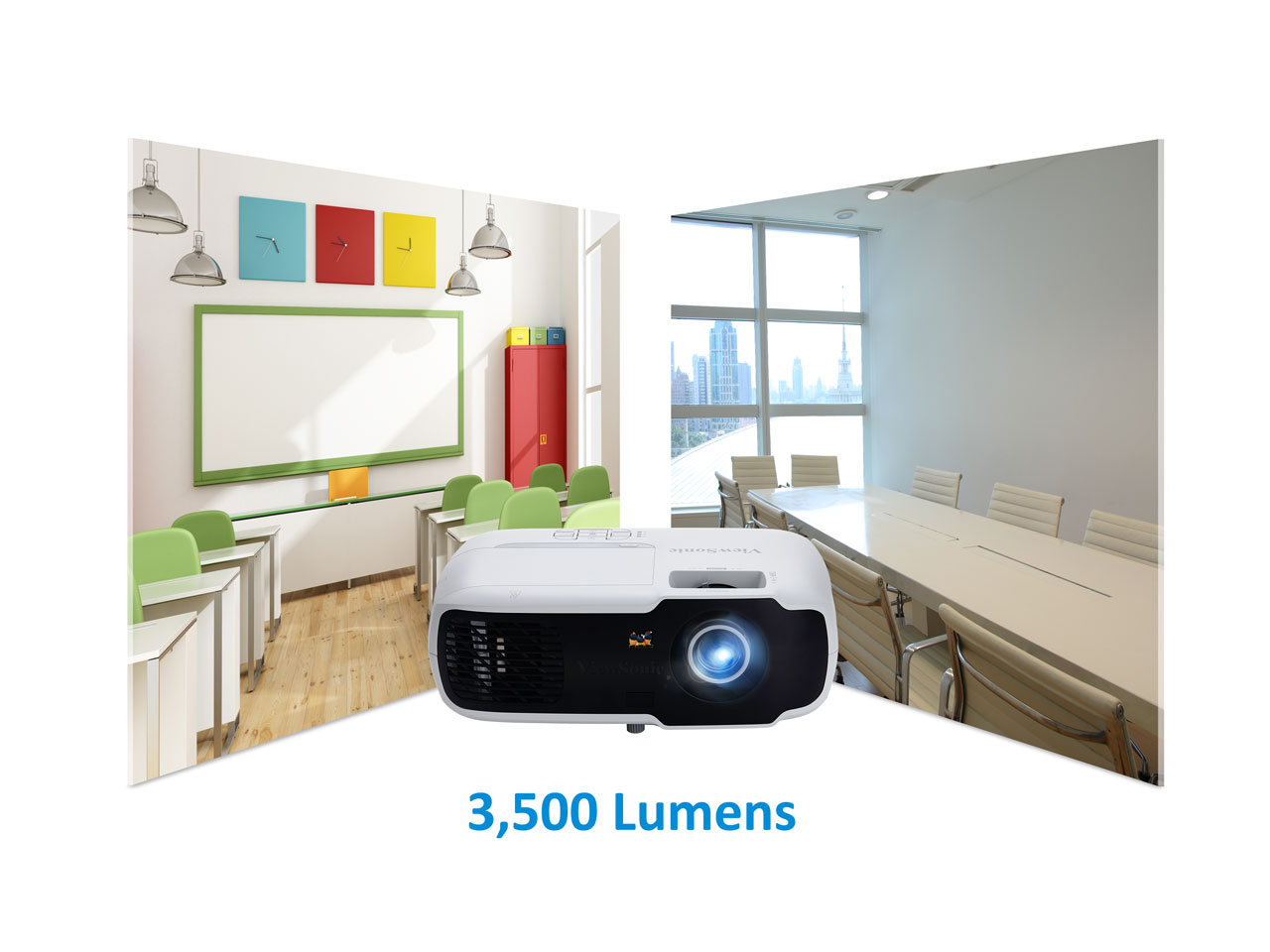 3,500 ANSI Lumens of brightness and a 22,000:1 high contrast ratio guarantee the production of bright images in any environment, including rooms with high ambient light.