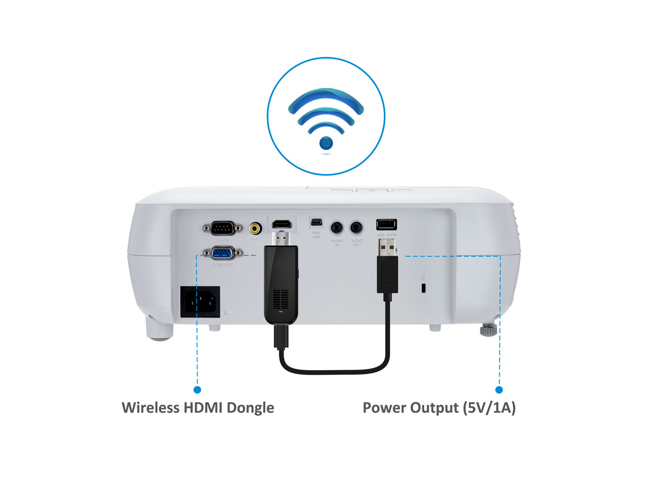 A built-in USB Type-A with power output (5V/1A) can be used to supply power to wireless HDMI dongles, eliminating the need for separate power adapters for connected dongles.